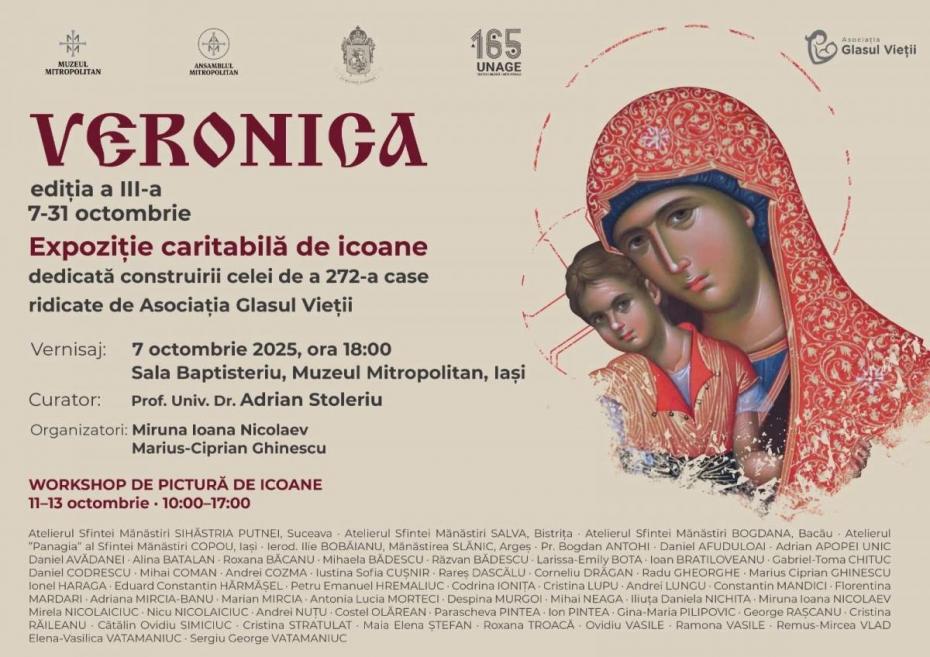 În perioada 7-31 octombrie 2025, la Muzeul Mitropolitan din Iași se desfășoară ediția a III-a a expoziției caritabile de icoane „Veronica”, un eveniment dedicat sprijinirii construirii celei de-a 272-a case ridicate de Asociația „Glasul Vieții”. Vernisajul va avea loc pe 7 octombrie 2025, ora 18.00, în Sala Baptisteriu a Muzeului Mitropolitan. Curatorul expoziției este prof. univ. dr. Adrian Stoleriu, iar organizatorii sunt Miruna Ioana Nicolaev și Marius-Ciprian Ghinescu.