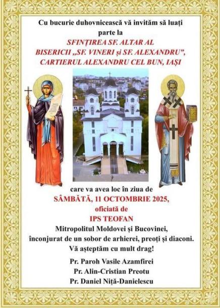 • 8.00-12.00: Sfințirea Bisericii „Sfânta Vineri și Sfântul Alexandru” din Iași, Protopopiatul 1 Iași, va fi săvârșită de Înaltpreasfinţitul Părinte Teofan, eveniment urmat de slujba Sfintei Liturghii.